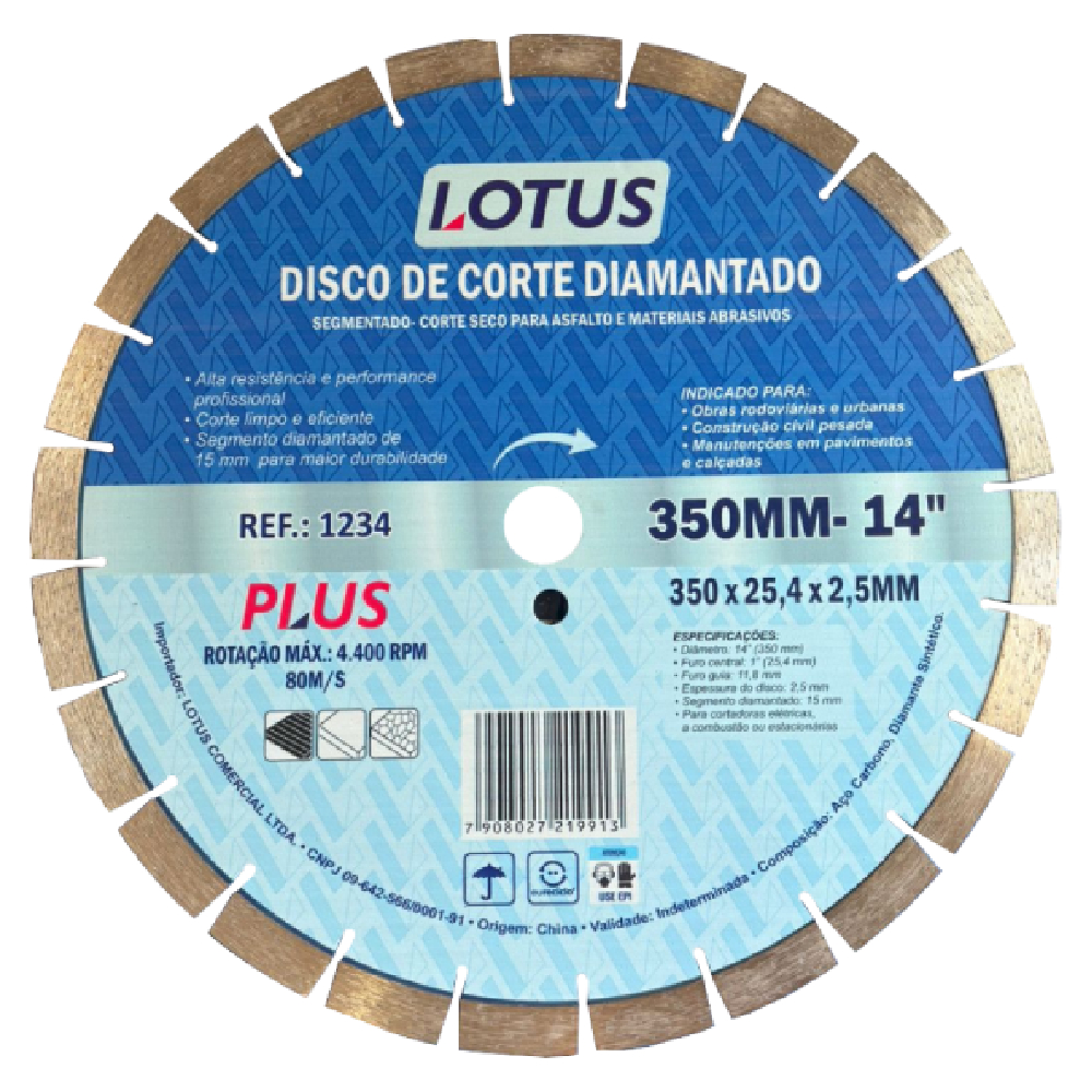Disco de corte diamantado segmentado Lotus indicado para asfalto e materiais abrasivos, corte a seco. Utilizado em obras rodoviárias e urbanas, construção civil pesada e manutenções em pavimentos e calçadas. Uso em cortadoras elétricas a combustão ou estacionárias.