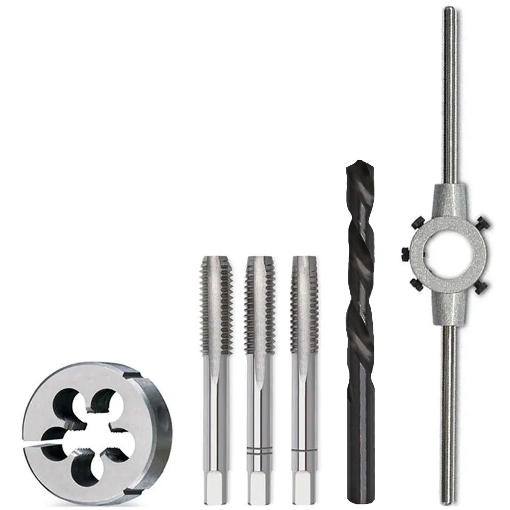 · Conteúdo do Kit: 3 macho manual (M9 x 1,25 rosca métrica grossa), 1 broca – 7,8mm HSS, 1 cossinete (tarraxa) – M9x1,25. 1 Porta Cossinete – medida 25 x 9mm.