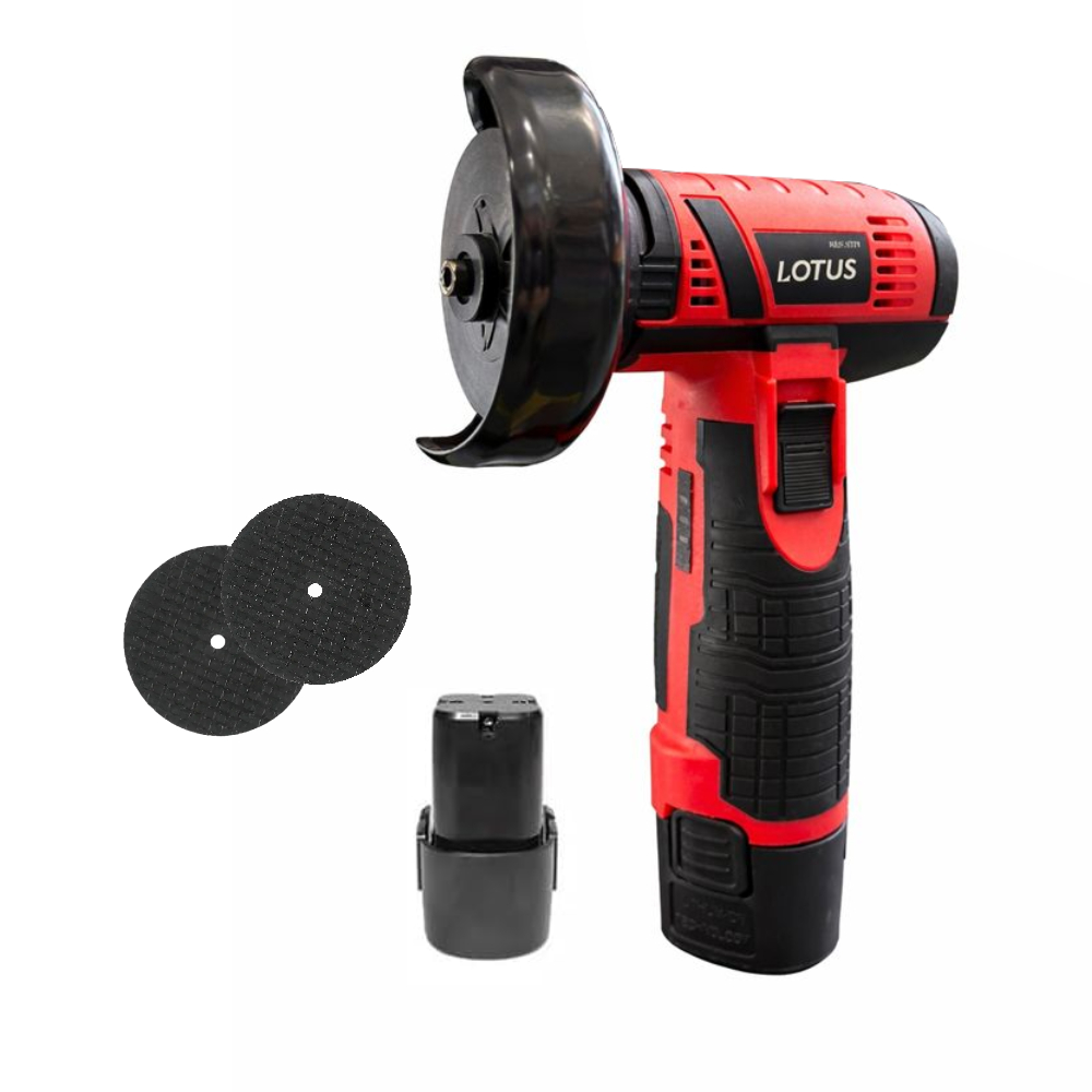 Mini Esmerilhadeira Angular Portátil à Bateria 12V Lotus, ideal para cortes, lixamentos e pequenos reparos. Indicada para madeira, metal leve, PVC, azulejo, entre outros.
