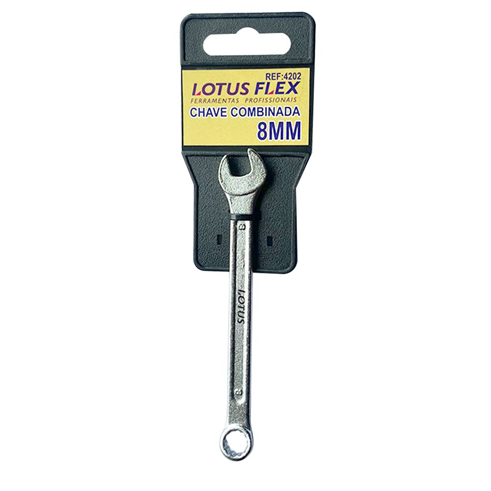 Chave Combinada Avulsa Lotus, confeccionada em aço carbono forjado, 100% endurecido e temperado, com acabamento cromado fosco. Possui uma chave fixa e uma estrela em cada ponta, em conveniente suporte de plástico rígido com clip para pendurar.