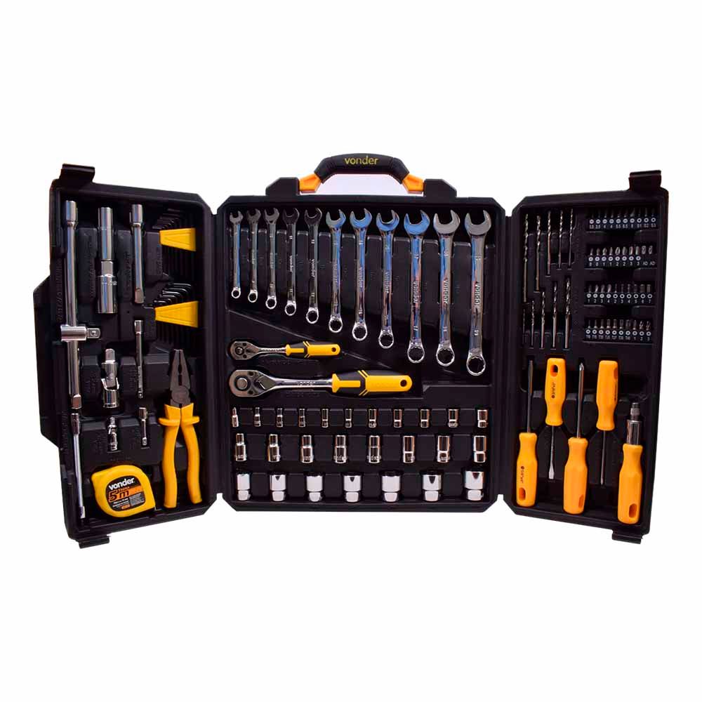 Jogo de ferramentas com 128 peças, embalagem fechada, Vonder é indicado para manutenções e reparos em geral. Proporciona maior praticidade, pois com apenas 1 jogo de ferramentas é possível realizar uma série de trabalhos. Acompanha maleta com encaixe perfeito dos acessórios, conferindo organização, praticidade e maior vida útil às ferramentas.
